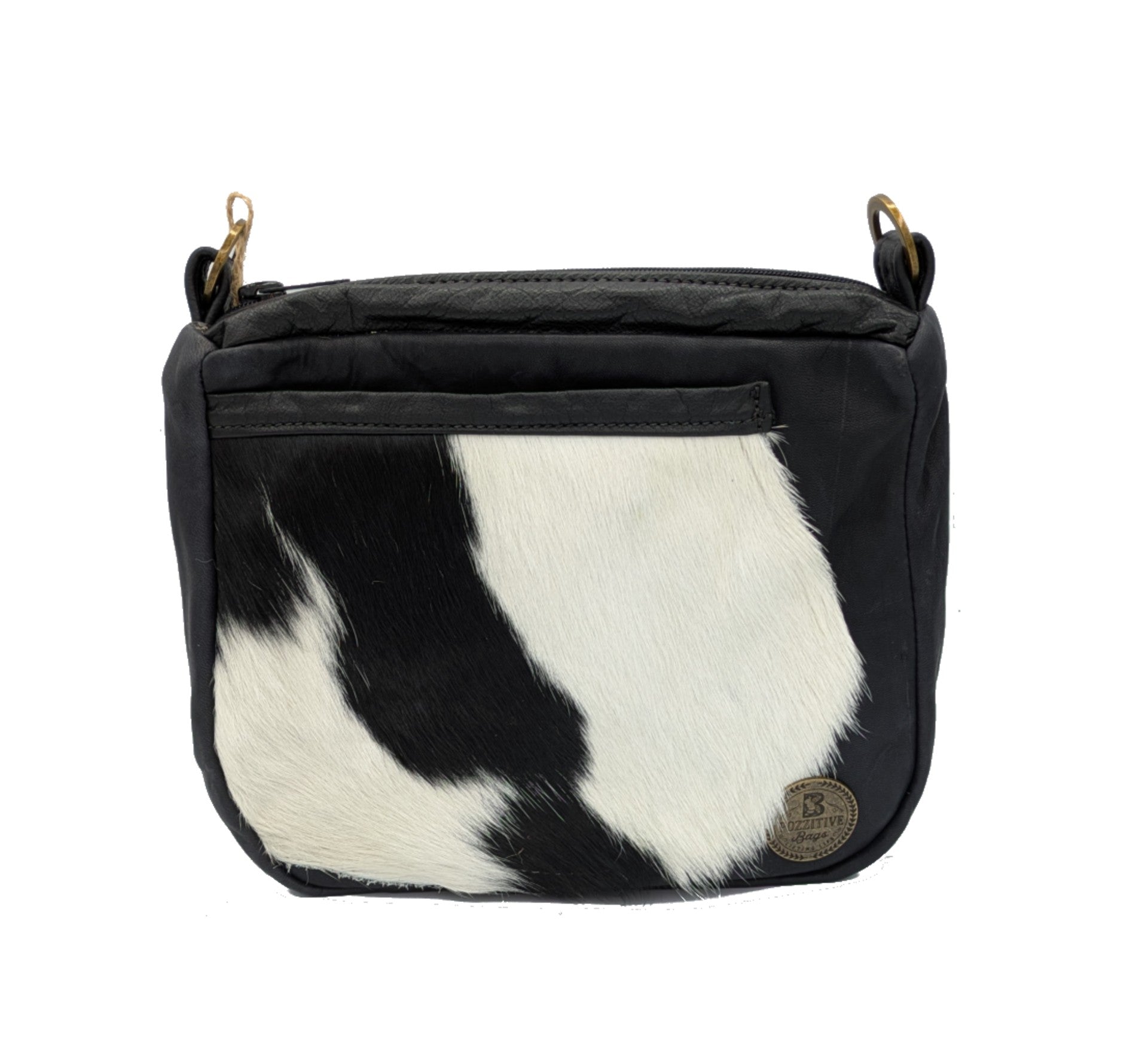 A piece of black and white, hair-on cowhide makes a great pocket for this Karol bag. Black deer hide was used to create the main bag. Inside, the reinforced cotton lining has one zip and two open slip pockets. The bag comes with a matching crossbody or shoulder strap.