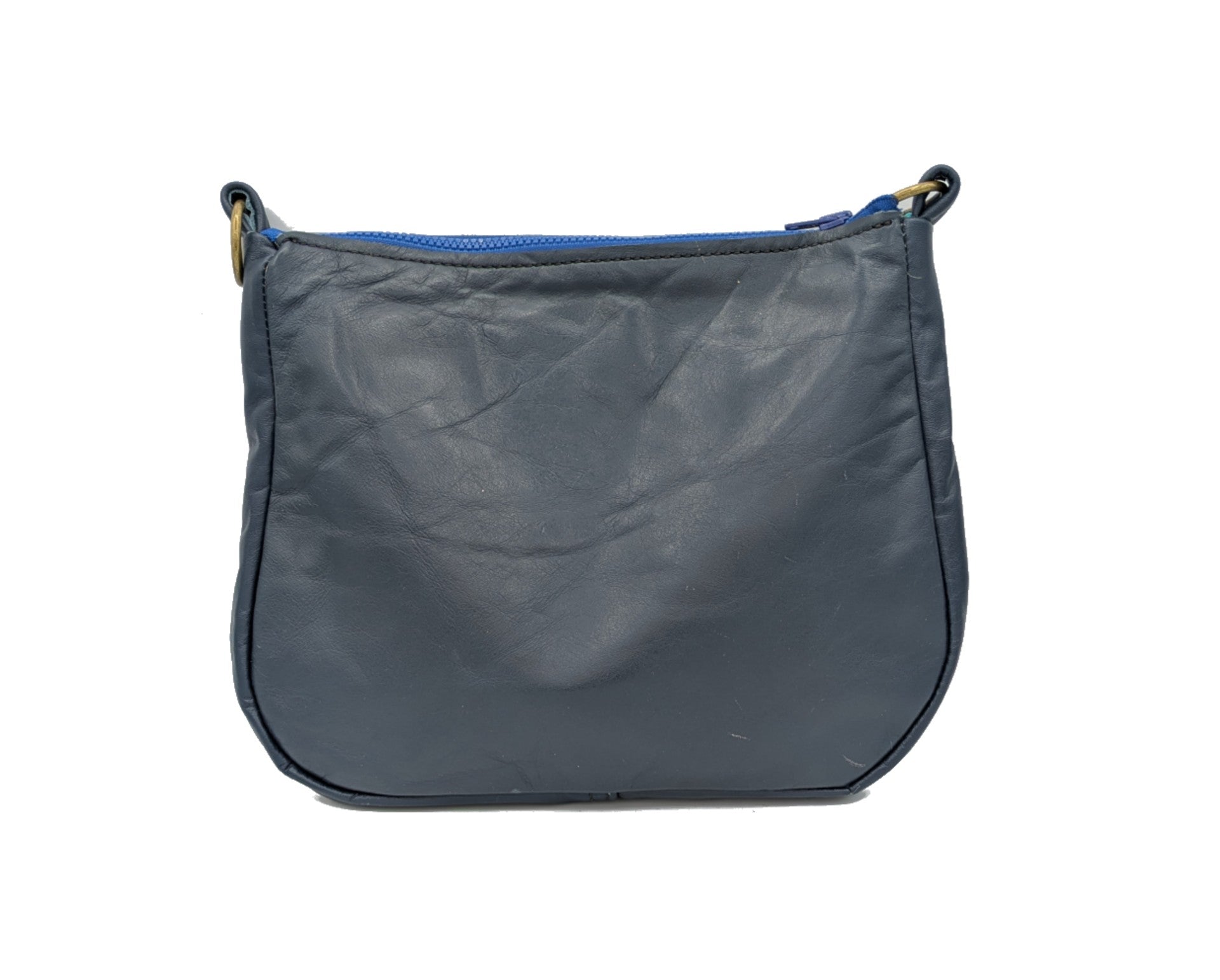 A leather fashion boot has become a fantastic phone pocket on this Karol bag. Navy blue leather from a couch has been used to create the main bag. Inside, the reinforced cotton lining has one zip and two open slip pockets. Every B. Pozzitive Bag comes with a strap: crossbody or shoulder.