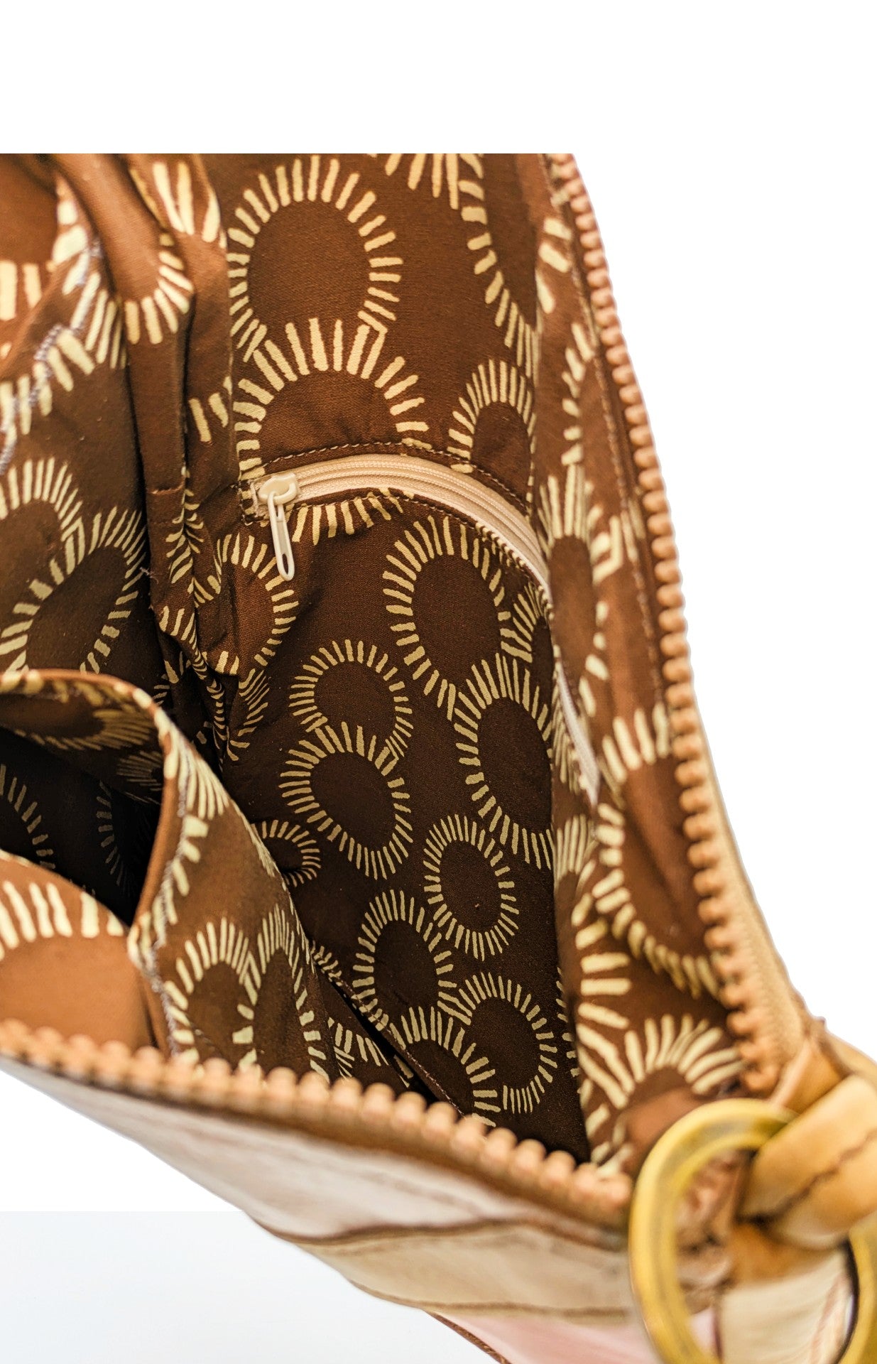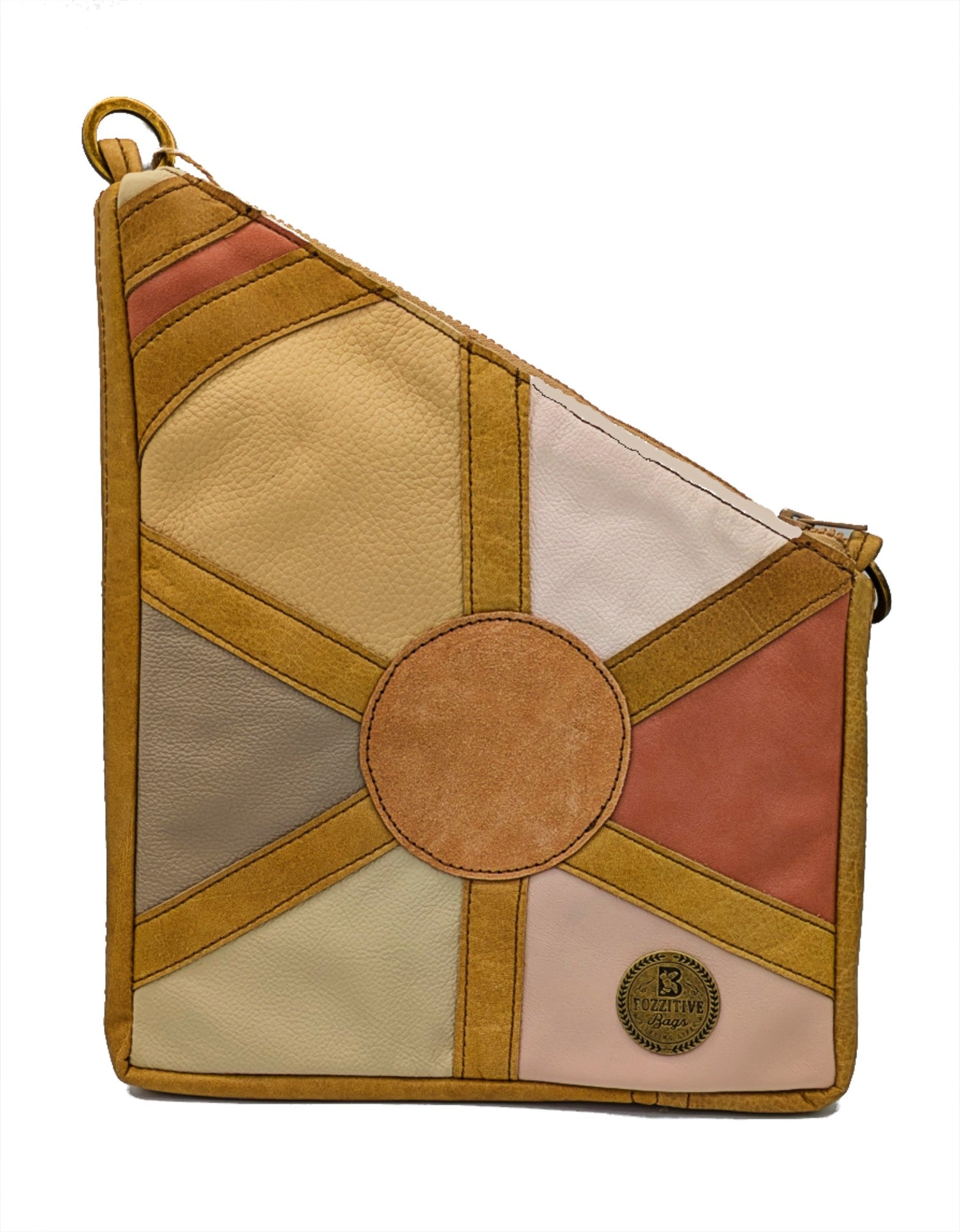 Leather furniture samples have been crafted into a geometric sun pattern on the front of this bag. Tan couch leather makes up the bag's sides, bottom, and back. There are no outside pockets, just art. Inside, the reinforced cotton lining has one zip and two open slip pockets. An adjustable crossbody strap is included.