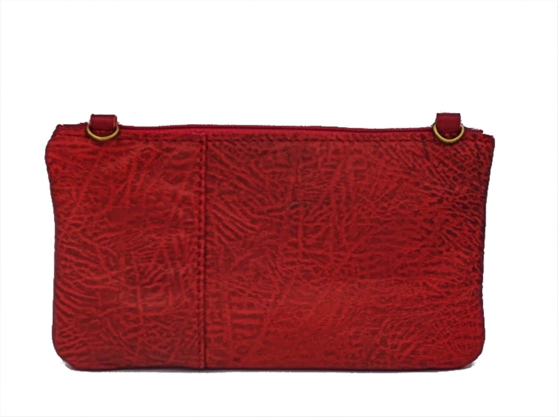 This clutch has been made from several red leather jackets. I've got a front pocket with a magnetic snap. This bag comes with a handle or strap.