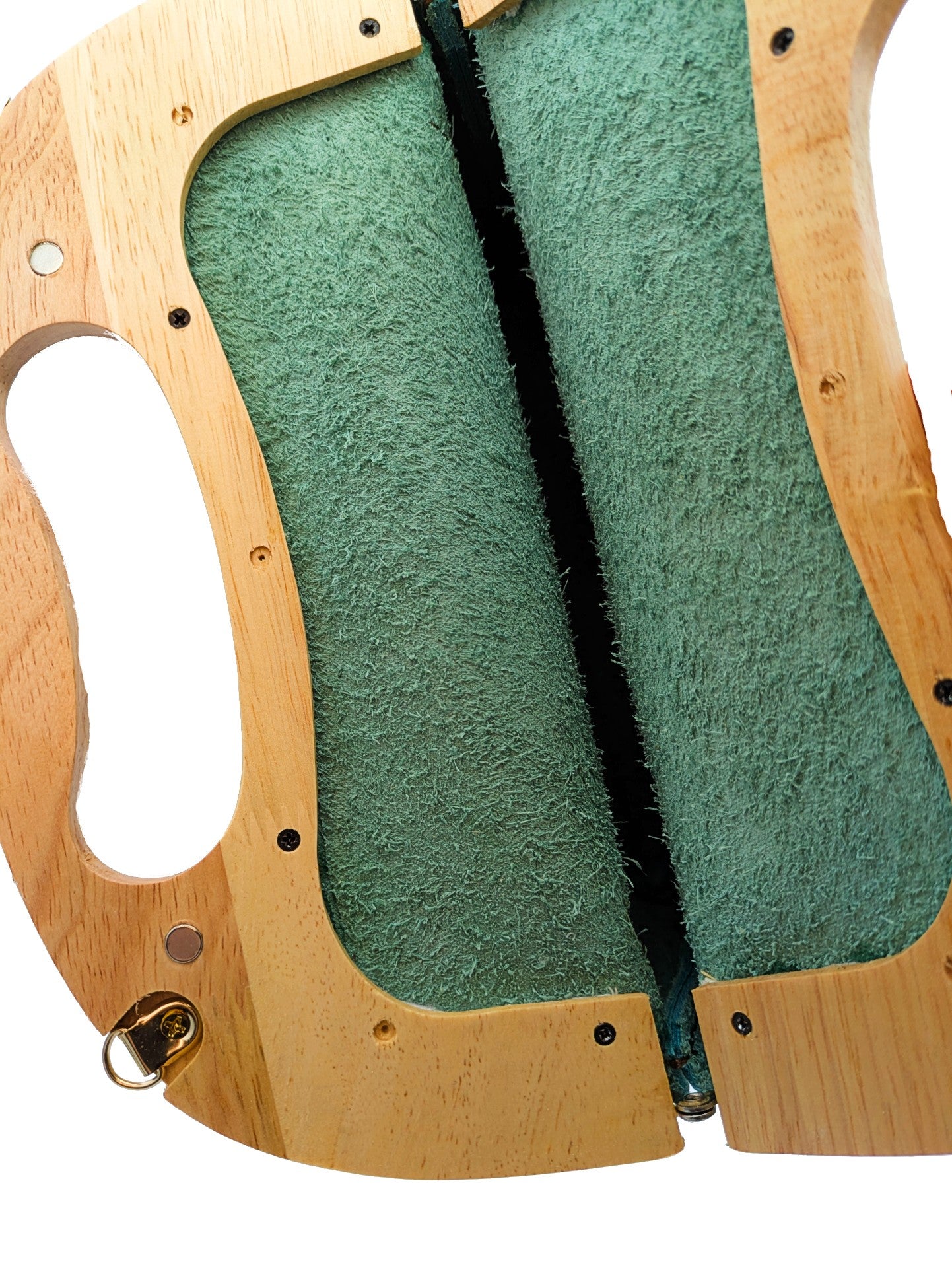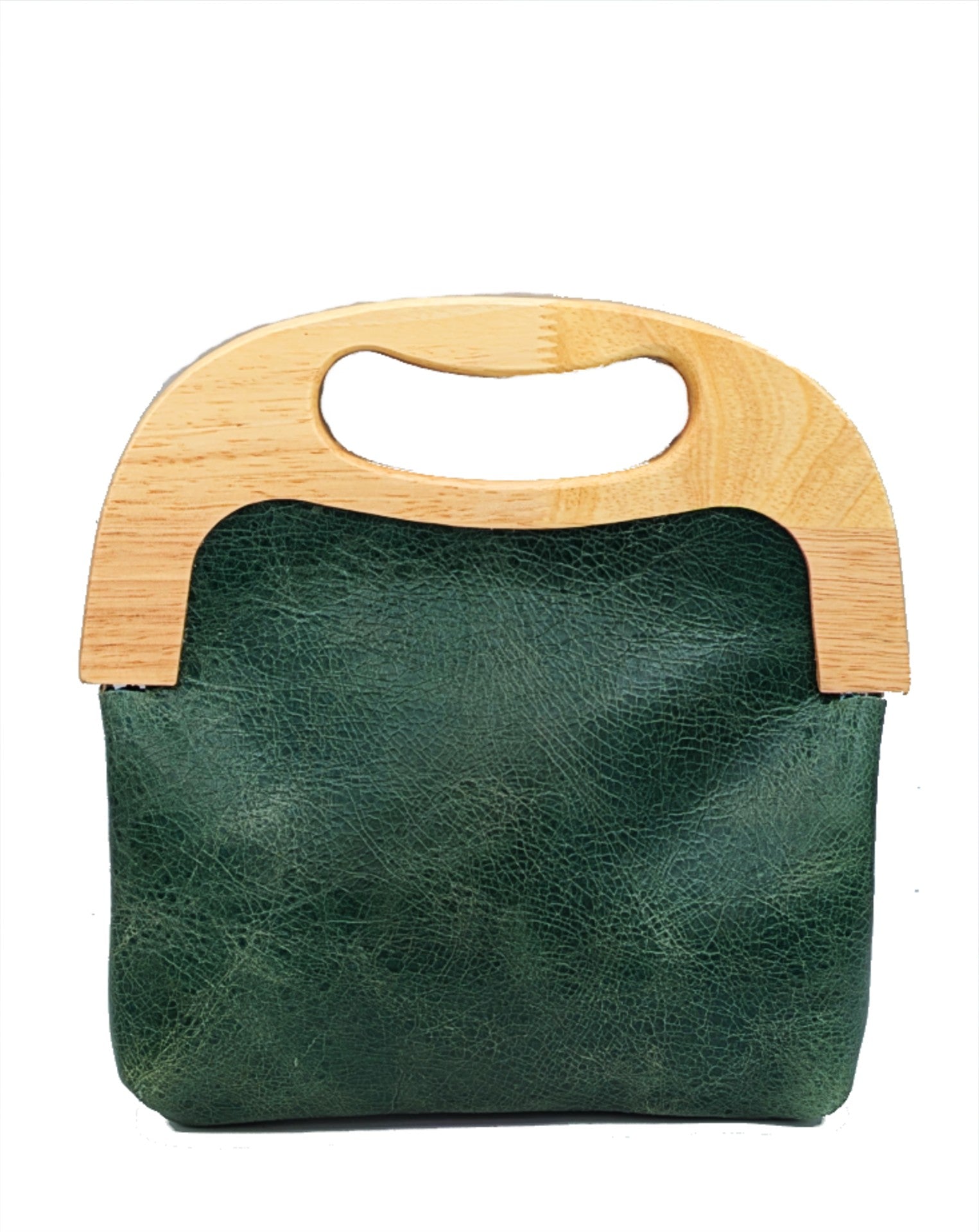 This Karol Clutch has been made from green chair leather. The brown pocket is from a FB Marketplace save. The magnetic, wooden frame is stylish and functional. Inside this bag is one open compartment.