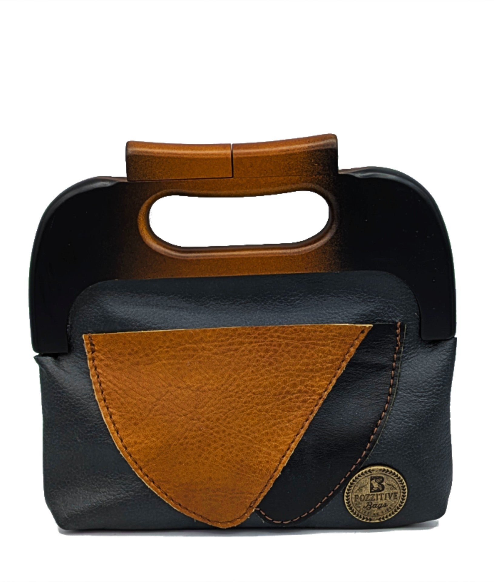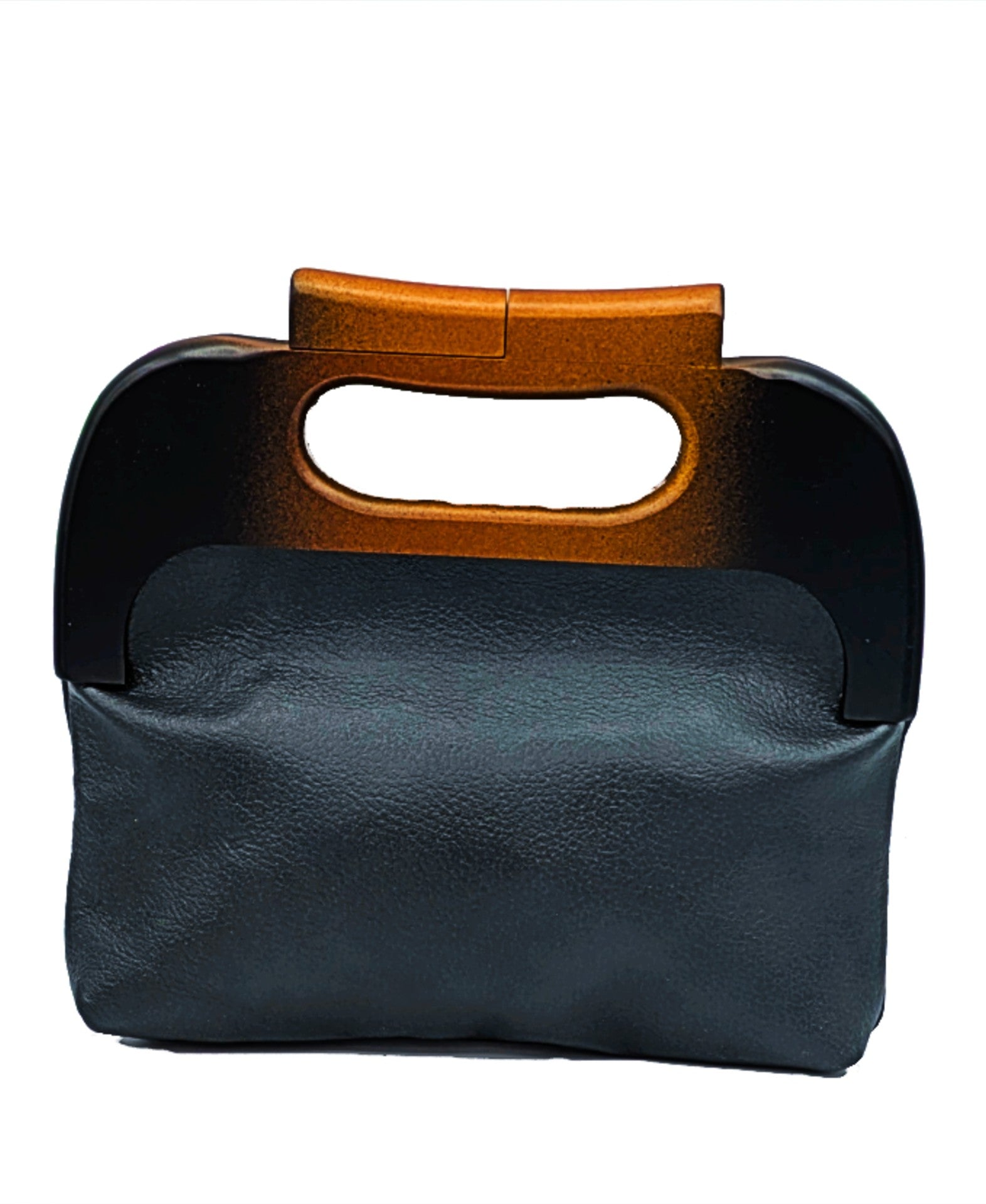 This Karol Clutch has been made from charcoal-colored couch leather. The brown and black pocket is made from leather furniture samples. The magnetic, wooden frame is stylish and functional. Inside this bag is one open compartment.